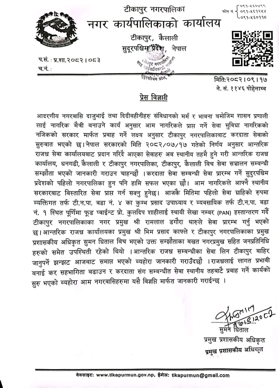 नेपाल सरकारको करदाता सेवा स्थानीय तहबाट दिने निर्णय अनुसार आन्तरिक राजश्व कार्यालय र  टिकापुर नगरपालिका बिच सम्झौता भई स्थानीय तहबाट करदाता सेवा सुरु भएको नगरपालिकाले जनाएको छ ।
