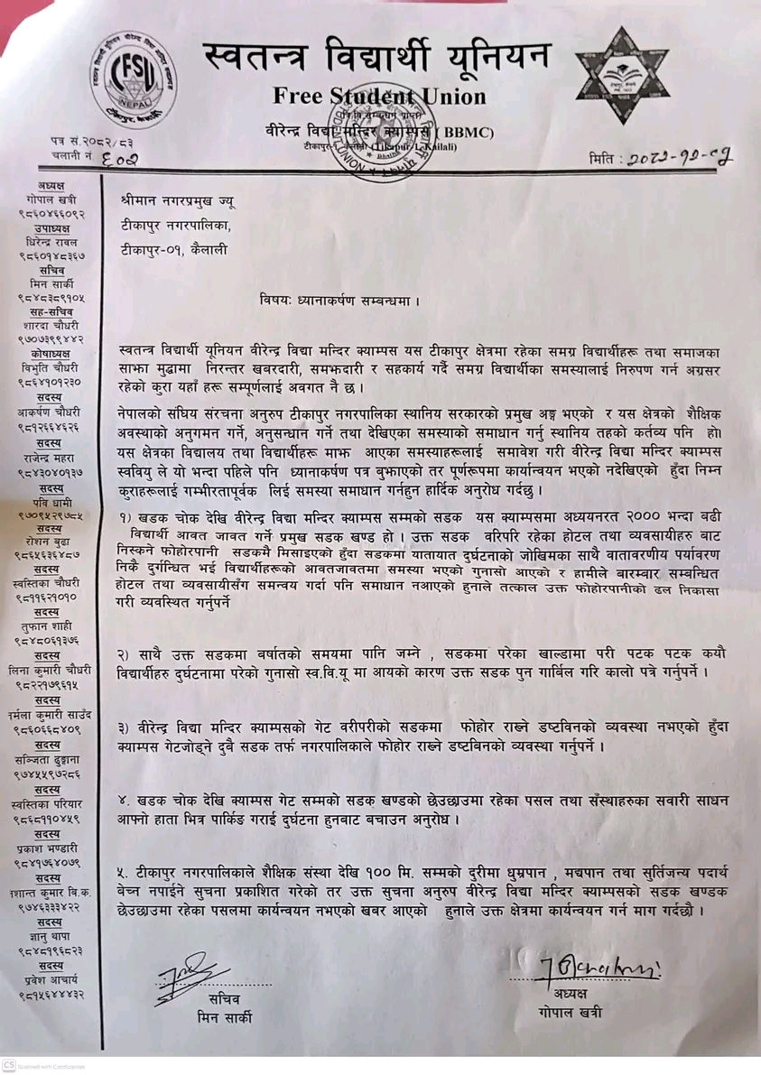 मोहित श्रीपाइली ,टीकापुर/वीरेन्द्र विद्या मन्दिर क्याम्पसको स्वतन्त्र विद्यार्थी युनियन (स्ववियु)ले टीकापुर नगरपालिकाका कार्यवाहक नगरप्रमुख तथा प्रमुख प्रशासकीय अधिकृत समक्ष ध्यानाकर्षण पत्र बुझाएको छ।